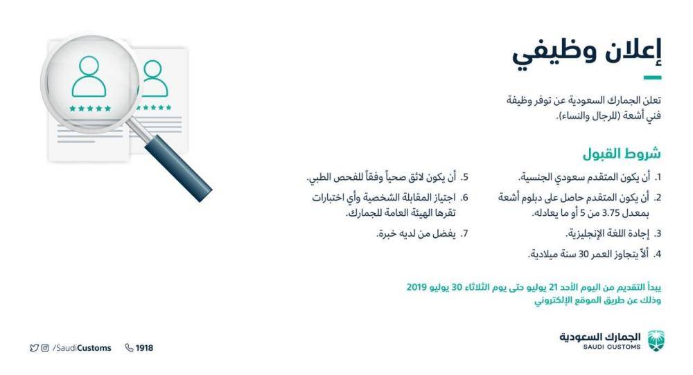 الجمارك تعلن عن فتح باب التوظيف بمسمى فني أشعة للجنسين جريدة الوطن