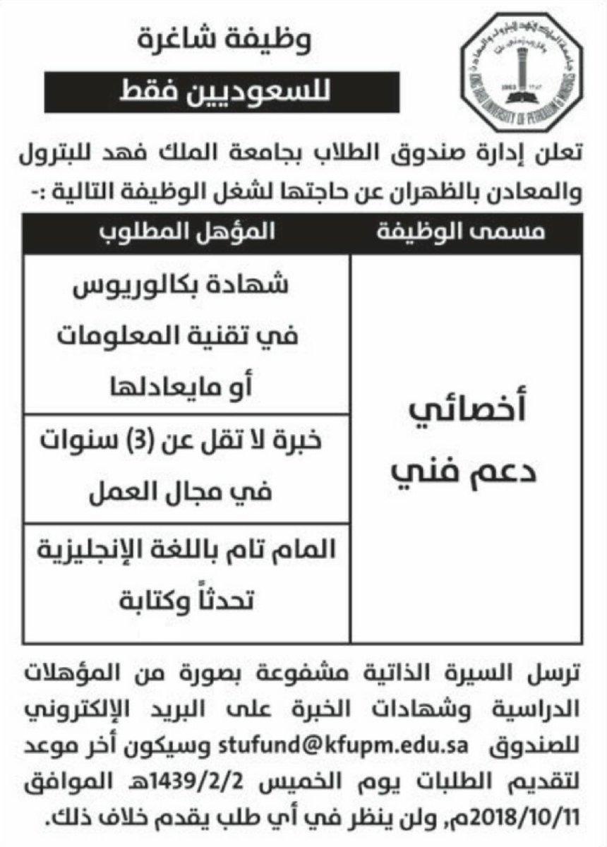 وظائف جامعة الملك فهد للبترول والمعادن 1439. جامعة الملك فهد للبترول والمعادن الظهران 31261 المملكة العربية السعودية. لم تتمكن وزارة التعليم من استكمال المتطلبات اللازمة لخطط وبرامج التوظيف. أستاذ أستاذ مشارك أستاذ مساعد محاضر م عيد م. والوظائف متاحة لحملة البكالوريوس فمافوق.