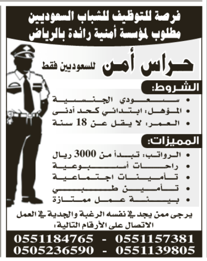مطلوب حراس أمن بالاحساء والهفوف واتس الوظائف