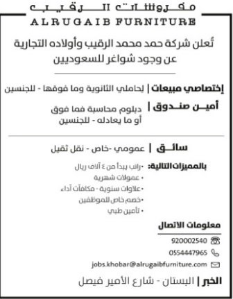 وظائف في الخبر للنساء. شاهد وظائف خالية و وظائف شاغرة واحدث فرص العمل فى الخبر السعودية. عرض 1 20 تصفية هل تود تلقي المزيد من الوظائف المشابهة لهذا البحث. وظائف روضة اﻷساليب الحديثة بالخبر أعلنت روضة الأساليب الحديثة عن توفر وظائف إدارية للنساء من خلال البوابة الوطنية للعمل طاقات بمسمى وظيفة مساعد إداري للعمل في مدينة الخبر براتب 4 000. اعلنت مطابع الرجاء للطباعة وظائف للنساء حديث التخرج في خدمة العملاء للعمل عبر برنامج دعم التوظيف لرفع المهارات التي كشفت عن توافر 6 وظائف نسائية شاغرة في مدينة الخبر بالمنطقة الشرقية وذلك بمسمى وظيفة ممثل خدمة.