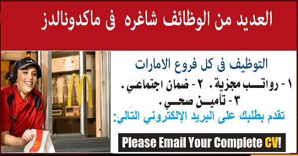 يعلن ماكدونالدز االامارات عن فتح باب التعين للشباب من الجنسين جميع المؤهلات Wazayf4u