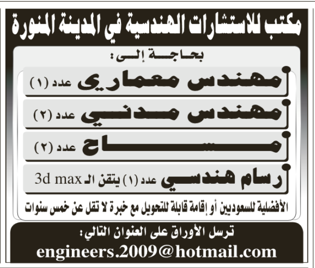 وظائف مهندسين في المدينة المنورة مهندس معماري ومهندس مدني ومساح ورسام هندسي للسعوديين او الاجانب