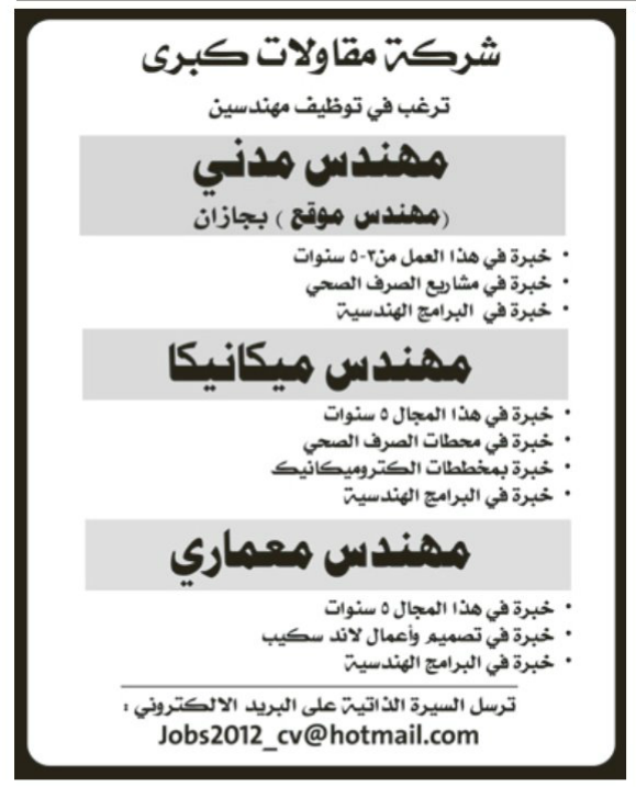وظائف مهندسين في شركة مقاولات كبرى في جازان مهندس مدني وميكانيكي ومعماري