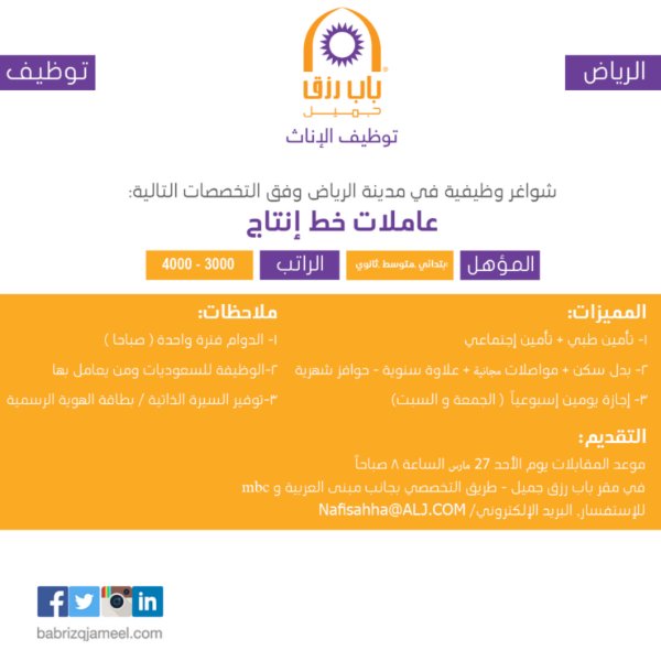 وظائف نسائيه عاملات خط انتاج في الرياض رواتب حتى 4000 ريال